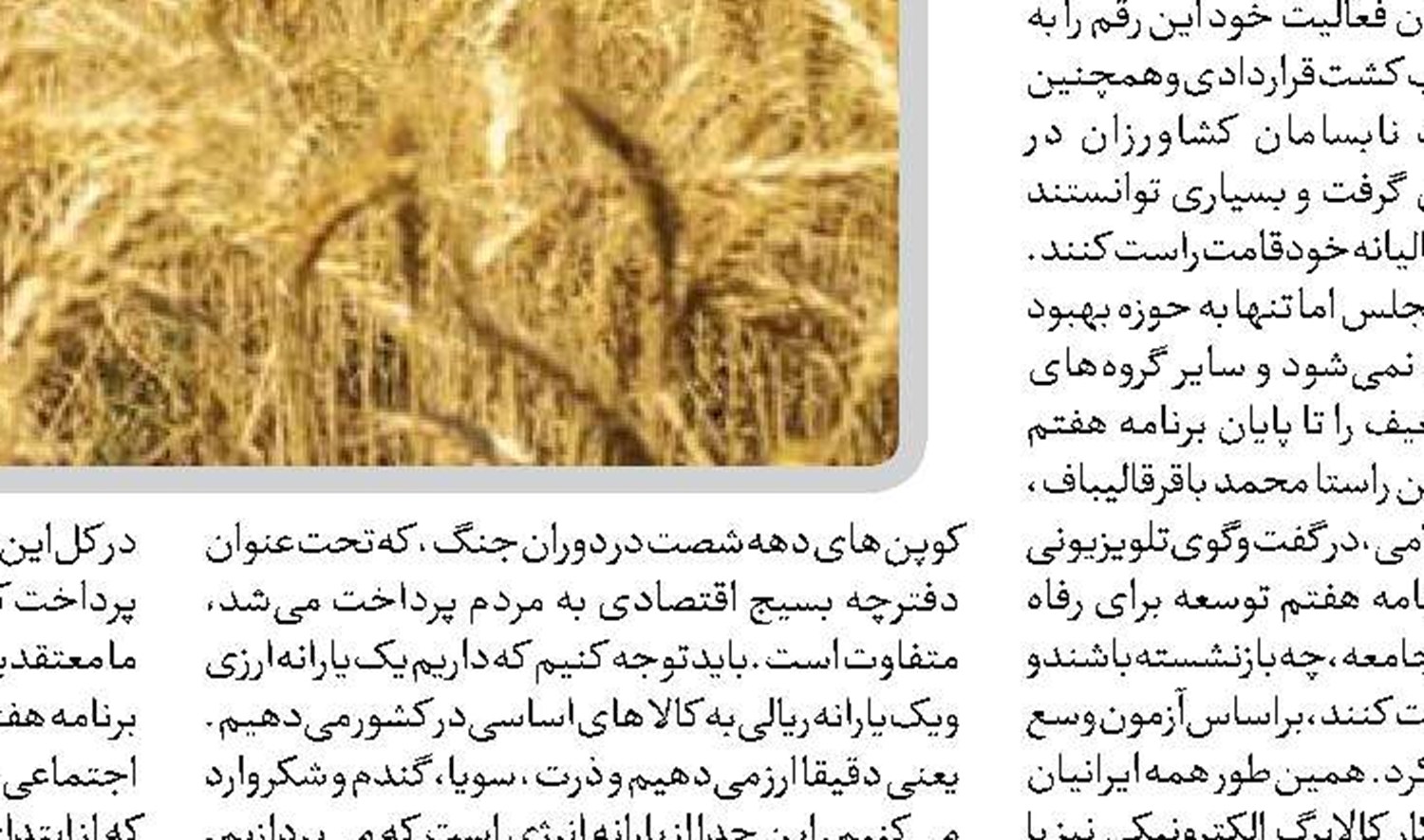 در سال جاری بهموجب تدبیر مجلس در حوزه شورای قیمتگذاری محصولات کشاورزی و همچنین تعامل دولت به خودکفایی حقیقی گندم رسیدیم و۱۰ و نیم میلیون تن گندم از گندمکاران خریداری کردیم.